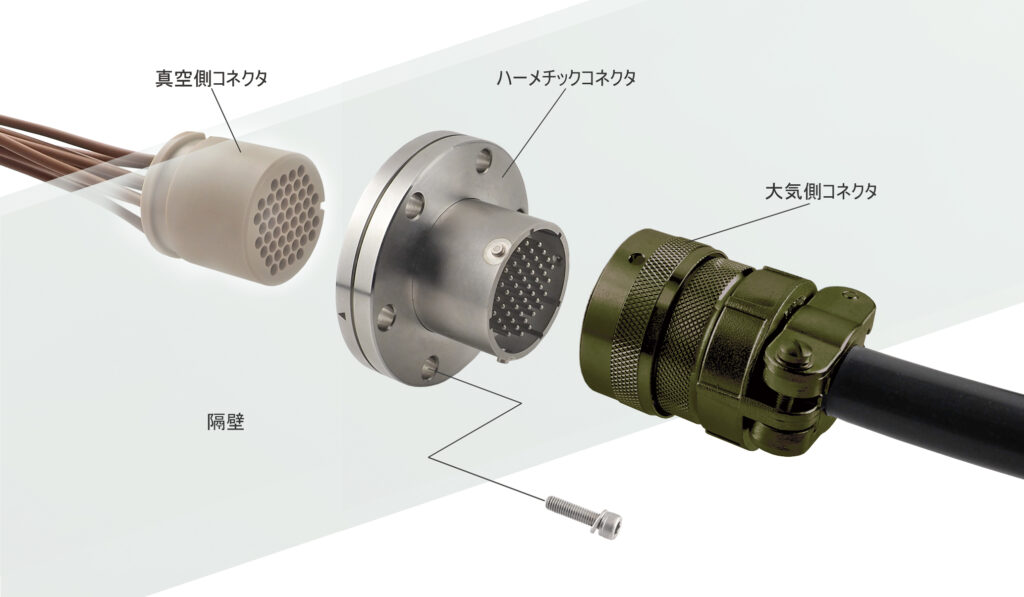 真空用気密コネクタは真空・圧力・ガスなどを封止する容器内部と外部を気密封止して電気的に接続する中継端子です。例えば半導体製造、医療装置、研究実験装置などで使用されます。